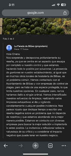 Read moreFuimos por el día de mi cumpleaños con mi pareja, teníamos hambre, estábamos caminando por la zona y decidimos ver qué tal. La comida estaba muy rica y me gustó su variedad de pintxos. A mi pareja y a mí nos sorprendió la cantidad de pájaros que habitaban y daban vuelta por el interior. A ella le disgustó mucho eso y aunque yo intenté no hacerle mucho caso ya que intentaba disfrutar la comida y descansar de tanto caminar. El servicio estuvo bien. Correcto pero sin más que añadir. Lo que me incitó realmente a realizar esta reseña fue la respuesta del propietario a la reseña de mi pareja que disgustada por la cantidad de pájaros quiso representarlo. Más allá de todo, me gustaría indicarle que este apartado que tiene Google sirve como espacio para que los clientes puedan dejar su opinión al servicio ofrecido, cosa que hizo mi pareja. Nosotros como turistas que vamos a descubrir y visitar una ciudad no paramos a pensar en las leyes y lo que el ayuntamiento de Bilbao pueda restringir o no. Si observamos que en un negocio de restauración ofrece comida donde hay pájaros que defecan lo podemos comentar. Invito a usted a reflexionar sobre el comentario que le ha dejado a mi pareja, ya que su reseña no incita ni intenta perjudicar su negocio. Porque para algo los clientes existen y son parte importante de cualquier negocio. Nosotros no tenemos la culpa ni nos hacemos responsables de los pájaros ni necesitamos saber más datos sobre leyes o prohibiciones. Sabemos que ustedes no tienen la culpa pero creemos que no es forma de responder a una simple reseña de una realidad que sufre vuestro negocio que queremos compartir. Si hay una persona que debería reflexionar sobre lo ocurrido debería ser el propietario que aunque le agradecemos que tenga tiempo a responder a las reseñas no se hace cargo ni responsable de los problemas y quejas de...