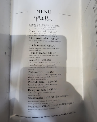 The food was normal and typical if a Nicaraguan dish. Although the portions were poor at best and on top of all that the exaggerated price of 20 to 25 euros a plate. For that i can go to a real restaurant with stars and staff. And the service leaves more to be desired. Lmao for the price its not worth my money and time 5 stars jjajaja not even 1. Before the prices were reasonable 10 to 13 euros... same small portions giant plate and the service was the same. But i got what i paid for now its... like they are taking advantage if the same people who helped build their business. My circle if inflence and I will not be returning until they change their predatory practice of business. There are many other Nicaraguan restaurants other than this one. And reasonably priced. With...