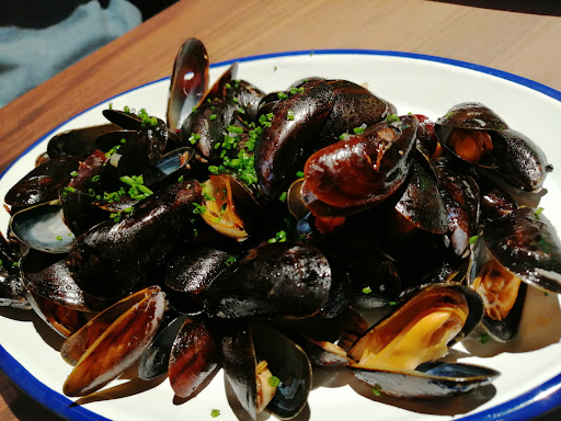 Comida: Es su principal atractivo, y a buena cuenta que, tras haber degustado más de la mitad de la carta, puedo decir que vale mucho la pena. Incluso fuera de carta, unos mejillones al vapor con caldillo marinero se comen como si fuesen pipas. Ya en carta, la bola de patata me recordaba a aquellas que hacía mi ama en casa, y es un buen snack para comenzar. Seguimos con una deliciosa coca de escalibada y sardina ahumada, textura suavecita y sabores que encajan a la perfección. El bocata de calamares, salvando el toque siracha, que yo preferiría alioli, ya que se come un poco el conjunto, muy suave tanto por el propio calamar, como su excelente pan brioche que lo envuelve. El canelón de Sant Esteve, aunque parezca enorme, que lo es, se deja degustar con ligereza. Y los postres, he tenido el placer de probar su crema catalana casera, cremosa y ligera a la vez, pero me quedo con su postre más chocolatero, una mezcla de jugoso brownie, crema de chocolate, nueces garrapiñadas y todo ello coronado por un sorbete de naranja sanguina, que ayuda a rebajar las tremendas calorías que voluntariamente vamos a ingerir, jaja. No en esta vez, pero me gustaría destacar las bravas, abundantes y con exquisitas salsas. El famoso bikini de rabo, si bien está rico, le falta algo de untuosidad, no se, algo de reducción a un lado o a modo de cama, se queda algo seco.