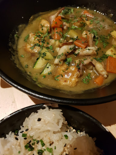 Read moreTeníamos ganas de probar este restaurante, ya que la cocina asiática es una de nuestras preferidas. Pero la experiencia no ha sido como la esperábamos. Teníamos reserva este sábado al mediodía (en el que por cierto hemos llegado tarde por motivos de fuerza mayor ) y cuando hemos llegado nos han sentado en una mesa pequeñísima (¿castigados?) - como de parvulario- entre el pasillo (abarrotado de gente arriba y abajo constantemente, además del barullo de la vajilla, que teníamos también acompañàndonos constantemente) y otra mesa a un metro de distancia. Hemos pedido que nos cambiasen de mesa pero la encargada, en tono muy seco, se ha negado rotundamente sin darnos ningún motivo convincente ni de peso. Se ve que solo tenía tiempo para ponernos mala cara y ser desagradable ya de entrada. La camarera, que nos ha atendido con profesionalidad y buenas maneras, nos ha parecido la única nota positiva de nuestra visita a este local. Era muy educada y amable, a pesar de que se veía que no daban a basto. La comida, correcta, sin más, aunque el tataki de atún dejaba mucho que desear. Las costillas de cerdo estaban buenas. La música de fondo tampoco favorecía al ambiente del local, aunque por cierto la decoración está bastante lograda. Es uno de estos restaurantes que se estilan ahora en los que la gran apuesta parece la decoración, en detrimento de la atención o la calidad del menú. Hemos tenido la sensación de estar en un lugar donde el cliente es lo de menos y los camareros y camareras, repetimos lo más amable de la experiencia, no daban a basto. Por cierto, si comes o cenas allí llévate una botellita de agua para el secarral de después, ¡el nivel de sal de la comida te deja deshidratado! Ha sido un ratito bastante desagradable. Mucho...