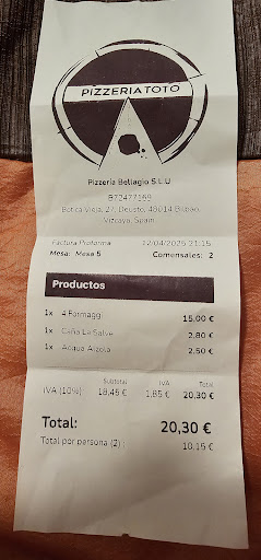 Aunque nos salió barato porque la margarita sin burrata era la pizza mas barata de todas 9,9€, la otra por el precio que tenía 15€, diría que mejor ir a otros locales de Bilbao de pizzas napolitanas, o sino, una del Domino’s yendo a lo barato.