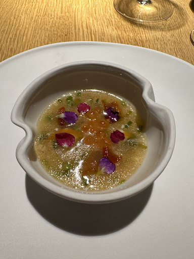 From start to finish, apart from the amuse-bouche, this entire menu was a disaster. Reflecting on this "dining" experience, I can only conclude that my meal would have been no different had they simply given me a cold bowl of bitter tasting gelatinous soup, a bottle of vinegar, and a straw. Throw in a small slab of rubbery, un-sliceable "fish" and that is now what passes for Michelin's idea of a one-star performance. (No hyperbolae involved...) By the end, I was sending dishes back because they were so overpowered with the taste of vinegar.