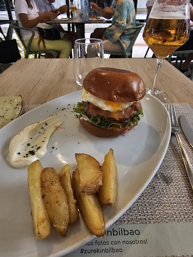 Read moreVamos a comer un menú del día en el Bar-Restaurante Zurekin, en la calle Diputación en Bilbao. Bien ubicado junto a la Gran vía bilbaína. Esperamos unos 10 minutos hasta que nos ubican. Hay opción de comer en la calle (a mí no me gusta, demasiado jaleo y gente pasando) en la planta del bar o en la planta -1. Es un menú del día de 20,60€ (cuatro primeros, cuatro segundos, cuatro postres). Nos ofrecen un gazpacho de remolacha como aperitivo mientras esperamos. De los platos que hay, elegimos el pisto y los ravioli como primeros. Los ravioli son grandes (vienen un par de ellos) y el pisto viene acompañado de un huevo escalfado y tiras de patata fritas (originales, nunca las había comido en ese formato). Está todo muy bien elaborado pero ambos platos vienen templados tirando a fríos. Los segundos platos son wok de sepia y solomillo de ibérico. Este último viene con salada de quedó de cabra, pero les pedimos que sin salsa y con patatas fritas. No nos ponen pegas al pequeño cambio. Los platos van con lentitud, entre el primero y el segundo pasan más de 15 minutos. Paciencia. Los segundos vienen también templados. El solomillo está bien de punto y de sabor, el wok demasiado dulce y la tinta solo aparece como una mancha en el plato, la sepia está excesivamente blanda y flota sobre un caldo que no recuerda a una salsa de tinta de sepia ni de lejos. Pero se puede comer, sin más. (A las 14:40 nos enteramos de que el pisto ya se ha acabado). De postre pedimos mousse de yogur, crepe de manzana reineta y macedonia (el otro postre era tarta de queso, pero la intolerancia a la lactosa pesa más que la golosura). Tanto el mousse como la macedonia están excelentes. No así la crepe, que no es crepe realmente sino una sábana gruesa de harina y leche que más parece que te estés comiendo un bocata de tortilla francesa que una crepe, que debería ser fina y delicada. La manzana es testimonial, el relleno es nata densa (viva la lactosa sin avisar). Dulce sí, pero esperaba algo más elegante, no la he disfrutado. No tomamos café y, llegado este momento, el comedor ya está lleno. Puntos: 6,5...