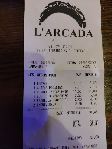 Visiting Binefar for business. Very hot weather. Everywhere closed on a Monday night. Called into La Arcada for food. Up a back street hidden away. A few locals sat at tables enjoying a beer etc. Ordered Tapas for 3. Let the waitress choose. Food was delicious. We eat our fill. Friendly staff. Good...