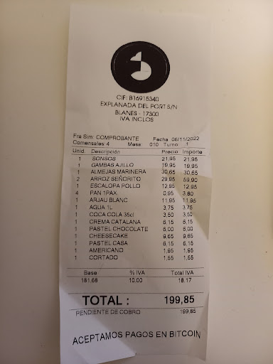 Read moreDesde hace un par de meses aproximadamente tiene nueva dirección. Forma parte del mismo grupo que el restaurante del Club de Vela y el Port Pesquer (frente a la lonja). Creemos que aún está en un proceso de definición del que será el producto definitivo. La atención profesional, diligente y amable. El servicio de mesa correcto. El ambiente agradable aunque, para mi gusto, un poco frio. Los platos muy completos, raciones generosas, de un buen producto bien cocinado. La carta de vinos un poco corta y en exceso escueta (ausencia del tipo de uva, procedéncia,...) Tal y como está, en el momento que hago la reseña, el tema de los precios con una rápida fuerte subida de las materias primas, me coge con cierta desorientación, pero a mi entender és excesivamente costoso: anchoas con pan y tomate, morralla con pescado excesivamente grande y poco variado (estrictamente no era morralla), una de chipirones, una de cigalas pequeñitas de playa, una de calamares plancha, una botella de vino albariño, dos vermuts y dos tarrinas de helado, 132 eur. El aparcamiento és facil, de pago durante el día, y el entorno, puerto y paseo maritimo bonito y propicio a dar un paseo antes y/o después de comer en el...