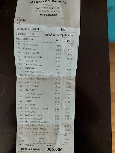 Read moreHola quiero hacer una reflexión . Vivo en Boadilla hace 20 años y vengo a la lonja a comer habitualmente y celebraciones de cumpleaños y aniversarios . Desde hace tiempo los fines de semana es un poco caos poco servicio hoy en particular la terraza a tope y dentro dos mesas hay dos camareros para todo Jaime es uno de ellos y una camarera otro chico que nos ha dicho que solo pone bebidas . Tenía mesa a las 14.15 nos han estado a las 14.45 porque Jaime no daba para más nos sientan otros 20 min para tomar nota y otros 30 min para la comida. Está clara que no es culpa de Jaime y el resto de camareros es delos que gestionan la lonja que hay falta de personal con lo que os cuento que es una pena que sales a disfrutar de una comida y que por falta de personal te vayas con una Mala experiencia de servicio . La comida buena pero se tienen que hacer mirar el reforzar al equipo de CAMAREROS y esto no es de este fin de semana es de varios y por eso lo escribo para que...