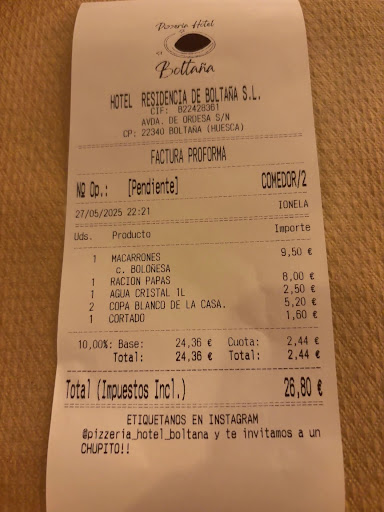 Read moreSomo 4 moteros que pasábamos de ruta. Nos alojamos en el hotel (limpio y correcto) y al atardecer para no complicarnos nos quedamos a cenar en la pizzería del hotel, situada en una terraza a la entrada del mismo. Nos atendió un chaval jovencito muy amable. Cuando trajeron las pizzas yo le pedi al chico si tenían aceite picante, me dijo que si, pero otro chico algo mas mayor que atendia mesas dijo con mala cara, que ya lo traería. Era un chico morenito, pelo oscuro y con barbita. Después de esperar un buen rato, empece a comer ya que se estaba enfriando la pizza. Al rato se acerco el chico y dijo que aun tenia el aceite ocupado ( nunca había visto un aceite tan ocupado, me quede flipando) Entre tanto se sento en una piedra de la terraza a trastear con el movil y hablar con unos amiguetes que le habían ido a ver mientras los otros camareros atendían a los clientes. Termine la pizza y cuado se acerco el chico a traer la cuenta, le dije que el aceite ya no era necesario y se quedo mirándome con cara de póker como diciendo “a mi que”, ni una mínima disculpa por su pésimo servicio. No se si era el encargadete o familia de los dueños, pero sea lo que sea este chico les va a hundir el restaurante por su pésimo servicio y su malísima atención. No le pongo 0 porque no puedo. Que tio mas negado para...