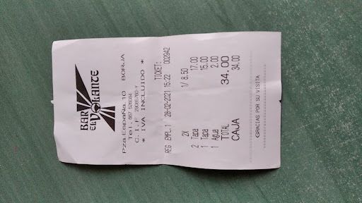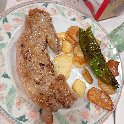 Read moreNo hay menú. Está en la plaza. Pequeño. Hay raciones, bocadillos y platos combinados. Carta no extensa. Habiendo una mesa sola y nosotros tardaron en servir unas patatas bravas 30' pasadas de fritura. Plato combinado de hamburguesa pequeña y patatas pasadas de fritura, pimiento verde a falta de fritura y huevo frito bien hecho. Raciones de pan sin cobrar. Agua y vino de Borja. El trato bien. 25€+-. Por cierto, falta limpieza...