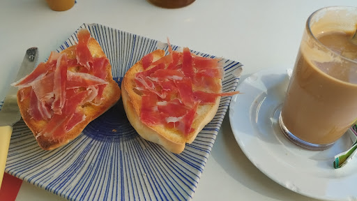 Cafe-bar donde desayuné, cafe muy rico, tienen varios tipos de pan, salmorejo y aceite con jamón. Me gustó que te ponen botella de aceite y salmorejo para que tu te sirvas. Y en la tostada buena cantidad de jamón y muy rico de bellota. Atención de 10, muy atentos y rápidos en el servicio. Tienen mesas fuera en una carpa para desayunar al solito. Ambiente tranquilo, familiar. Precios asequibles.