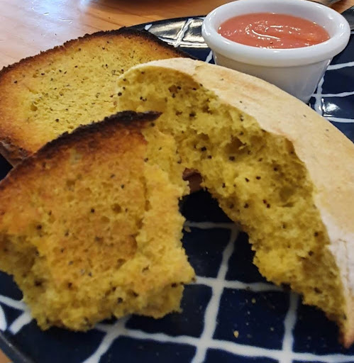 Yo soy tradicional y solo aposté por pan especial, he pedido pan de cúrcuma con semillas de amapola (los especiales son piezas no medias) con aceite y tomate natural triturado. El tomate estaba muy sabroso (no es fácil que el tomate tenga sabor en los desayunos de bares al uso) y el aceite es un aceite de diez, aceite los ángeles, que para más inri es de Sevilla. El café estaba bien rico y en taza grande. La cuenta ha sido 3.20€.