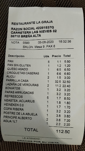Fuimos a almorzar un día festivo con reserva, no estaba lleno. Pedimos entrantes (cómo se detalla en la factura), las 5 croquetas según mi familia estaban muy buenas aunque pueden ver en la foto la cantidad de salsa de acompañamiento., por mi parte agradecí que tuviesen pan sin gluten. El queso asado estaba mejorable, y muy escaso al igual que la mínima cantidad de salsa que pusieron para acompañarlo. Las lasañas estaban moderadamente buenas. Me pareció un abuso cobrar cada unidad de pan y lo peor es que eran muy pequeños. Pedimos la parrilla de la casa que según el camarero era para 3 personas (32,50€) y realmente era para 1 adulto y medio, contando que pedimos entrantes, papas arrugadas, boniatos, alioli y el pan., MUY ESCASA LA CANTIDAD DE CARNE, estaba buena porque la podías terminar de hacer al término de cada gusto en la plancha, que por cierto echaba demasiado humo y la mesa era pequeña. Las papas arrugadas estaban muy duras, les faltó mucho tiempo de cocción. El postre de la abuela estaba bueno. Éramos 5 personas pero uno ya había almorzado así que sólo degustó las croquetas y poco más.