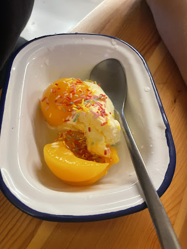 El segundo plato, carrilleras con puré de patatas, fue aún peor. El puré llegó frío, y la carrillera era un bloque de carne dura y sin ninguna ternura. Después de esto, ni siquiera queríamos probar el postre, pero al estar incluido en el menú, decidimos ver si mejoraba la experiencia. La manzana asada estaba decente, aunque era una porción muy pequeña, y el melocotón en almíbar parecía salido de un menú infantil: dos mini trozos con pepitas de azúcar de colores que no aportaban nada.