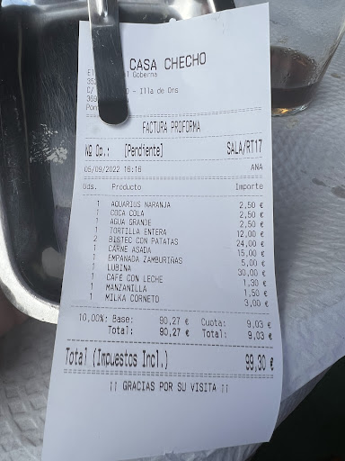 Read moreComida aceptable, precios relativamente altos y algunos aspectos mejorables. Lugar de la visita: Casa Checho Fecha de la visita: 20.06.2019 Este restaurante se encuentra situado en un lugar inmejorable, en la ruta de acceso al pueblo y enfrente del mar. Consta de la parte del bar, propiamente dicha, con sus mesas en el interior y en la terraza exterior, todas ellas las típicas de bares, y la zona interior del restaurante, más elegante, donde puedes ver como hacen la comida, ya que la cocina es abierta. Éramos cuatro personas y hemos comido, una empanada de zamburiñas (8,80 euros) para dos personas que estaba muy buena, dos raciones de pulpo (44 euros) en caldeiro con patatas, que estaba bastante bien, pan, cervezas, agua, vino y cafés, todo por 70,80 euros. Los precios de las bebidas son más altos de lo normal, si bien la ración de pulpo a 22 euros me parece excesiva. Aunque los empleados son agradables e intentan servirte lo mejor que pueden y saben, la realidad es que NO son camareros profesionales (dicho por una de ellas) y que además se nota viendo cómo se desenvuelven. Había poca gente comiendo, pero no quiero ni imaginar cómo será en plena temporada alta, ya que si no tienen profesionales cualificados, los comensales se van a desesperar esperando que les sirvan. También tienen que mejorar los aseos, que los tienen un poco descuidados, y reponer papel de secar las manos (no había) y el papel higiénico, que sólo había en el...