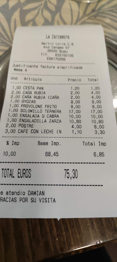 Después optamos por un plato para cada uno. Elegimos así, una ensaladilla de la zarzamora, una ensalada de queso de cabra y un solomillo de ternera. Señalar varias cosas. Primero, la carta no era muy extensa y cuando llegamos nosotros (las dos de la tarde) ya había varios platos que no les quedaban. En un primer momento pedimos dos solomillos, porque aunque iban justos, nos dijeron que había, finalmente solo había para una ración. En mi opinión, si tienes una carta corta no puedes quedarte sin los ingredientes en el turno de mediodía. Aún así, los platos estaban bien de sabor y con una cantidad razonable. Decir que el solomillo tuvo que volver a la cocina a qué lo hiciesen un poco más, a pesar de que se indicó que se quería muy hecho.Para cerrar, tomamos dos postres realmente buenos y tres cafés con hielo.