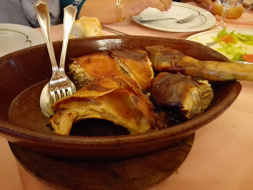 Los asados se piden para 2 comensales (un cuarto de cochinillo) y pedimos uno de cochinillo, otro de cordero y ensalada para cinco adultos. Venían con nosotros dos niños y aunque no tenían opción de menú para niños como tal, nos acomodaron pedir un plato combinado a nuestro gusto. A pesar de que fuimos temprano y el local estaría a mitad del aforo, fueron excesivamente lentos en tomarnos el pedido y traer la comida, aunque es cierto que trajeron los asados juntos y nada se enfrió. El de cordero estaba bueno, correcto, pero el de cochinillo estaba magnífico, justo en su punto. Seguro que luego vuelvo y no me está tan bueno, pero cuento la experiencia que tuvimos.