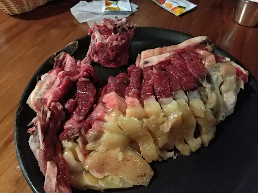 Es injusto valorar el trabajo de cocina por el mal servicio que nos han dispensado. Pedimos para cuatro comensales 4 primeros, pulpo, jamón cocido y 2 de percebes y 4 segundos un bacalao, un rape y dos de churrasco de buey con sus patatas, ensalada y 2 chorizos. No puedo decir nada malo de la comida pero si del pésimo servicio recibido. Los primeros platos pulpo y jamón llegaron súper rápido, pero los percebes tardaron un poco, nada que nos enrrareciera el día o la comida. Pero lo peor llegó en los segundos. Nos sirven una de bacalao, tras un largo tiempo nos llega el camarero y nos indica que se han quedado si rape, que pídamos otra cosa. ¿Qué pasa no han tenido tiempo para indicarnos que no les queda este plato y han esperado a que uno de los comensales fuese servido y que se le enfríe la comida para decírnoslo?. Bueno, no vamos a ser tiquismiquis y pedimos otro plato, en este caso bacalao. Al comensal que tenía el bacalao en la mesa le mandamos comer ya que se le enfriaba. Llegó el otro bacalao y las dos de churrasco, el camarero nos indica que enseguida nos trae las patatas, ensalada y criollos. Pasaron más de 20 min. y no llegó lo que le pedimos. Se le reclamó otra vez y nos indicó que la ensalada no la tenía apuntada en la comanda, pero le indicamos que las patatas y los criollos si que estaban. Nosotros seguimos a lo nuestro pero lo que faltaba siguió sin aparecer, pero cuando todos ya habíamos terminado de comer apareció el camarero con la ración de patatas, pero sin criollos, a lo cual le indicamos que no son horas de traernos lo que quedaba. Al final, tras la mala experiencia, nos marchamos sin pedir ni postre ni café. Pero eso sí, como es de ley pagamos lo que nos correpondia pagar. Tú crees que el camarero o alguien del comedor se dignó a acercarse a la mesa y pedir disculpas por lo...