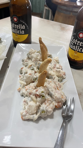Read moreEstábamos alojados a unos pocos metros y queríamos cenar pronto que salíamos en ruta a la mañana siguiente, vi las valoraciones y decidimos probarlo. El bar cuando entras te recuerda a un bar de los de toda la vida en sitios que no han tenido el boom de población como las grandes ciudades, se ve como el típico bar de siempre donde va gente de todas las franjas de edad. Había algún que otro guiri como nosotros pero la mayoría era gente local, cosa que da pistas que muy mal no se come ni se bebe. He visto críticas respecto al trato del dueño o del personal, se ve a la legua que este señor es un trozo de pan, tiene la manera de hablar fuerte de la gente del norte, pero de grosero ni maleducado nada, es más, nos asesoró genial con la comida para no pasarnos de cantidades, cosa que es de agradecer y el vino en copa que me sirvió estaba muy bueno también y no era de los más "conocidos". Relación calidad-cantidad-precio inmejorables, si vuelvo por la zona...