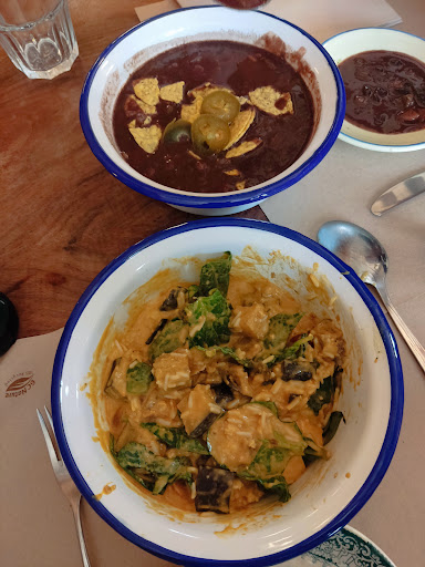 Siempre dicen que hay que probarlo. Y yo como buen crítico culinario lo pruebo casi todo. En fin la figa ta tia. Es un sitio para más bien ir a tomar un café o una bebida y charlar con los amigos o estar de tertulia. Haber de mi experiencia como comensal no me acabo de gustar. Sé que es un nuevo estilo de cocina pero en mi humilde opinión para los que somos comedores y los que vivimos la pasión por comer. Este sitio deja un poco que desear. Os explico. Es un local vegano que está situado en un callejón detrás de la catedral de Burgos. La impresión cuando entras es un local bohemio y hecho para gente más de los que comen poco que los que comemos. Subes unas escaleras dentro de una casa de hace un montón de años y te encuentras con un comedor con sillas. Se ve que son también de hace años pero menos la barra todo es de hace muchos años. Hay que decir que la chica que nos atendió era muy maja y servicial. Pero lo primero que nos dijo es que nos pusiéramos nosotros mismos la mesa. Luego muy amable nos explicó lo que había de comer. Pero todo es vegano. Cómo podéis ver en las fotos. Yo pedí una especie de comida hindú sin carne y mi señora una especie de alubias pintas. Pero claro sin chorizo. En fin, salí con más hambre de la que entré. Pero repito que todo estaba bien. Y si vais y sois veganos y queréis probar. Os lo aconsejo al cine por cien. Os gustara. Y el precio está acorde con la comida. No...