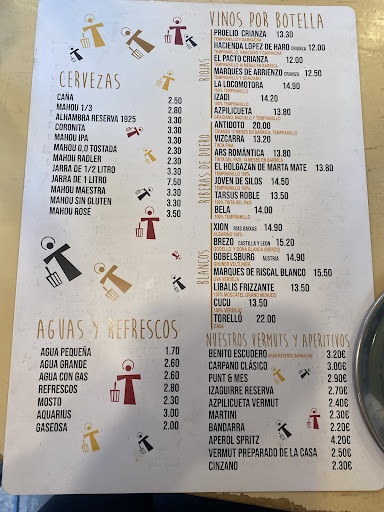 Read morePrecio desorbitados y cartelería engañosa. Una auténtica decepción. Nos animamos a entrar pues siempre está lleno y en esta ocasión parecía que había dentro hueco, al menos en barra. Pedimos dos marianitos (vermu pequeño) y una ración de bravas, cuyo precio en la pizarra de dentro marcaban 2€. Como estaban las mesas llenas, y comenzaba a entrar gente, decidimos salir fuera dada la situación actual. A partir de ese momento, todo fueron momentos que fueron restando intención de volver. Tardaron más de 20 minutos en servirnos las bravas, junto con la cuenta, pues la chica nos lo saco conjunto. Las bravas aceptables por la salsa, pues las patatas parecían de las congeladas. Al mirar la nota, cual fue nuestra sorpresa al ver que nos cobraban 2,50€ de cada marianito , que nos pareció desorbitado pues en otros locales de la zona no superan los 2€; y 2,70 € de unas patatas Mixtas, cuando habíamos pedido bravas. Al preguntarle a la chica si estaba el precio correcto nos dijo que sí, que ese era el precio con suplemento de terraza.Fue una sorpresa que llevara suplemento de terraza, pues no lo indica en ninguna parte visible, y dada la situación por la que estamos pasando, aunque se hayan eliminado restricciones, un ... desde nuestro punto de vista, abuso... Aunque, según la camarera es política en la zona. De todas formas, si teníamos dudas de los precios, teníamos una hoja en la mesa con los que, según ella corresponden a los de terraza. Las bravas marcaban 2,50€, algo menos que 2,70€ que nos cobraron. Al comentar con la camarera que nos parecía que no era correcta la nota, pues en cada sitio del local indica un precio distinto y no se ve aviso de suplemento de terraza, chica nos contestó " diganselo a mi jefe" con mal genio y actitud brusca. A nadie nos gusta lidiar con estas situaciones, pero es necesario un poco de tacto y quizás preguntar a los encargados antes de contestar, en especial si se lleva poco tiempo. Con lo que por un precio desorbitado e incoherente, tiempo, trato personal y productos, no es un local que recomendemos. Para estas cualidades hay otros mejores y de precio más ajustado. Para pagar este tiquet, voy a otros en esa misma zona o en las próximas, con mejor calidad y...
