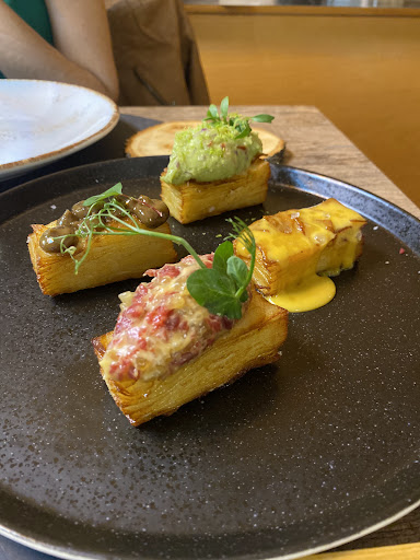 Excelente experiencia, trato y comida! Estuvimos comiendo ayer en el restaurante el Menú diario (Albor) por 25€. Lo primero destacar que, desde que llegamos, la chica que estaba atendiendo las mesas fue muy profesional y amable con nosotras. Atendió todas nuestras dudas y estuve pendiente de la mesa sin estar encima de nosotras. Nos sentaron al momento que llegamos (con reserva). El tamaño de la mesa muy adecuado, no se hizo pequeña en ningun momento con los platos. El menú se compone de aperitivo, primero, segundo y postre + agua + 1/2 botella de vino por persona (en nuestro caso al ser 2 personas pedimos 1 botella). El aperitivo fue un trozo de tataki de atún macerado con sésamo y mahonesa de wasabi que estaba muy muy bueno. De primeros pedimos la Flor de Colifor y la Lasaña Tikka Masala. Mencionar que ambos platos estaban realmente buenos y las raciones fueron más que suficiente. De segundo nos decantamos por el bonito a la plancha, el cual nos preguntaron por el punto que deseabamos (poco hecho/ al punto/ muy hecho) y el Wellington de cerdo ibérico. El bonito plancha estaba MUY bueno y, como se puede ver en la foto, fueron unos tacos muy generosos.
