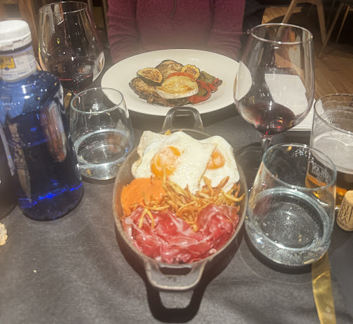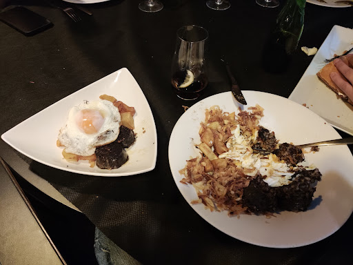 Read moreFuimos mi pareja y yo. En sala sólo había una camarera que era la que se "comía todos los marrones". En barra y cocina sin embargo había mucha gente, por lo que era increíble que entre plato y plato esperásemos tanto tiempo. No éramos sólo nosotros, (al entrar sólo había una pareja más). Los comentarios de la gente que había a nuestro alrededor eran idénticos. Una pareja con su hija llevaban casi una hora y la señora ya quería irse, (normal). Si hay mucho ruido en la calle, poner música dentro del local no es buena idea, puesto que la gente de dentro eleva más el tono de voz y el escándalo es mayúsculo. Este aspecto lo tendrían que tener en cuenta porque es muy desagradable comer así. En cuanto a la comida, yo pedí menú del día finde y comí parrillada de verduras con queso de cabra. He de decir que estaba deliciosa. De segundo, bacalao, no era espectacular pero no estaba mal. Mi pareja, menú burgalés finde, comió huevos rotos con patatas y morcilla. El segundo huevo debió huir del plato y nunca más se supo de él, la morcilla muy rica al igual que los torreznos, eso sí deben estar ambos en extinción porque era una cantidad exigua. Este plato debía de ser problemático, pues a nuestro lado había una cuadrilla de seis o siete personas que de empezar riendo por lo absurdo, terminaron enfadándose, (eso sí, sin dejar de poner ironía al contratiempo. De segundo mi pareja pidió cordero. A ella no le gustó. He de decir que me lo comí yo y opino lo contrario. La carne estaba tierna, melosa, bien condimentada y buena de sabor. Los postres... Tarta de queso ya no había. ¿? Los segundos clientes en la sala y ya no hay? Y sorbete de limón con/sin alcohol. Tras nuestra cara de estupefacción y después de más de media hora, aparece mágicamente una tarta de queso y un sorbete sin alcohol. Habíamos pedido con alcohol, pero mi novia ya quería acabar cuanto antes y dio buena cuenta de los dos, pobrecita mía. Yo tuve más suerte con la comida La camarera, pobre chica, nos ofreció invitarnos a un café por la tardanza en servirnos los platos. Aclaro que no nos quejamos en ningún momento, ni hubo miradas de presión hacia ella, pero yo creo que lo estaba pasando tan mal que quiso tener un detalle. Se lo agradecimos, declinamos la oferta, puesto que el ruido ya era ensordecedor y queríamos salir de allí. Una pena, porque bajo mi punto de vista, con más organización y un poco de empatía con la clientela sería una experiencia muy...