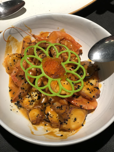 Probamos el tartar de vieiras y atún, que no solo estaba delicioso, sino que venía presentado de forma muy original sobre un tablero del juego de la oca, añadiendo un toque creativo y divertido. También pedimos las delicias de morcilla con foie, una combinación muy bien lograda, y las bravas, que no en vano ganaron el Premio Delicias 2022: crujientes, sabrosas y con un punto picante perfecto.
