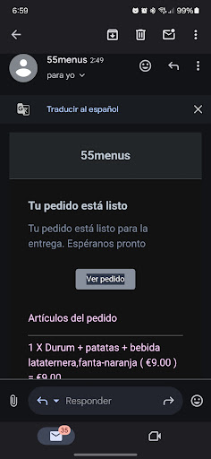Read moreEra cliente habitual y siempre iba a recoger mi pedido (no soy de usar plataformas porque tardan mucho). En su fachada tienen la publicidad de 55menus (al estar cansado esta vez digo, voy a pedir por ahí) y hago el pedido por ahí el 4 de septiembre (pagado ya). A la hora y media llamo porque es mucho la espera y me dicen que no trabajan ya con 55menus y que vuelva a pedir por glovo. A lo que le digo que tienen la publicidad de la empresa y, además, el local activo en la web y me vuelve a decir que no, que lo pida por glovo. Obviamente mi pedido no llegó y he mandado reclamación a 55menus pero el correo tampoco es válido... más ha sido mi sorpresa cuando a las 3 am de hoy (7 de septiembre) veo que el restaurante acepta El pedido y cambia el estado a "entregado" por lo que el "ya no trabajamos con 55menus" es una mentira y se han quedado con el dinero en vez...