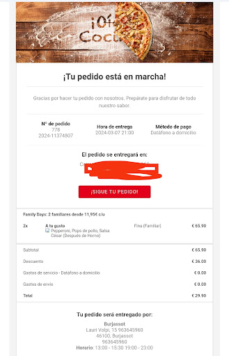 Read morePedir las pizzas para las 9, que lleguen a y veinte, sin la salsa cesar, como tantas otras veces que se les olvida aunque se lo indiques también en notas del pedido y del reparto, te falta un letrero luminoso, pero claro es que cuando alguien no quiere hacer bien su trabajo ni por esas. Que vuelva el repartidor casi 20 minutos después y me diga que sus encargados le han dicho que la salsa tengo que pedirla como ingrediente y pagarla ya es de traca cuando así lo hago, y además se lo indico en todos los sitios posibles y por supuesto la pago. Me parece de una desfachatez total, último pedido a este Telepizza, prefiero coger coche e irme a otro más lejano, por supuesto las pizzas llegan frías y secas, increíble la poca vergüenza de algunos, subo la foto del pedido para que a esos que encima de equivocarse(nos puede pasar a todos pero ¿siempre?)replican al cliente, les quede claro que tiene un problema grave de comprensión lectora, lo siento por el papelón que le ha tocado al repartidor por tener unos...