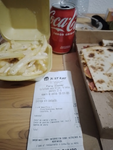 Read moreIndignante, hago un pedido online de una pizza mediana y cola de 2 litros, lo pone todo en el ticket, y me traen una pizza margarita que no lleva nada de lo que yo e pedido, unas patatas crudas que tampoco había pedido, y un bote de coca cola que tampoco había pedido, se lo dices al repartidor que venía con unas pintas bastante desagradable, con una actitud de no querer trabajar ni entender el idioma, en resumen, 9 euros a la basura, me toco...