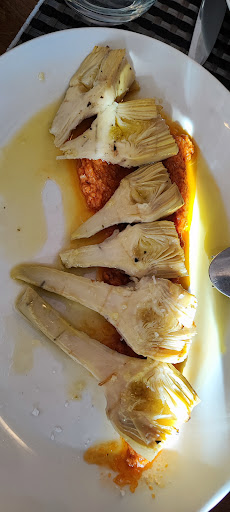 SERVICIO NEFASTO. Fuimos a cenar y nos atendió una camarera para las bebidas pero no nos quiso dar las cartas porque, según ella, esa no era su tarea y las cosas funcionaban así allí aunque ella no estaba de acuerdo. Nos quejamos de nuevo porque llevábamos mucho tiempo esperando la carta y la camarera nos dijo lo mismo. Cuando por fin nos la dieron (bastante tiempo después), pasó lo mismo para tomarnos nota. Pedimos unos 8 platos para compartir y nos llegaron un par de ellos, el resto de platos TARDARON 1 HORA Y MEDIA en llegarnos. Los camareros pasaban de nosotros y hubo un punto en que ya nos lo tomábamos a risa. Finalmente, tuvimos que ir a la barra a quejarnos y amenazar que nos íbamos. La escusa que nos pusieron fue que sólo tenían 2 freidoras y que, como nosotros, había mucha gente que había pedido fritos, después se nos acercó un camarero a la mesa recriminandonos que habíamos pedido todo fritos ( resulta que la culpa es nuestra y no de ellos que intentan abarcar más de lo que pueden). Lo curioso fue que, justo después de quejarnos y ver el cabreo que teníamos, nos llegaron todos los platos a la vez en 10 minutos. Total, teníamos reserva a las 9 y acabamos de cenar a las 11 y media.....2 horas y media para cenar (el chiste se cuenta sólo). La comida tampoco fue nada del otro mundo. Estaban buenos: la tarta de manzana, las croquetas y los huevos con puré de patata. El cachopo bastante malo (saladisimos) y el bacalao y los chopitos muy normalitos. Las cantidades bastante pequeñas. La calidad/precio muy desajustada. Lo mejor del lugar es el sitio donde está ubicado,...