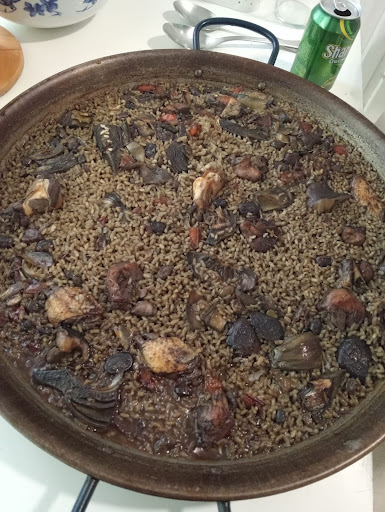 Encargamos dos arroces, uno negro y otro de pollo. El negro estaba bueno, pero el de pollo vino como aparece en la foto, negro y además sabía a caldo de arroz negro. Cuando fuimos a decírselo a la dueña del restaurante, no solo nos dice que a veces coge ese color por las verduras, si no que, de muy malas formas, nos dice que no sabemos lo que es un arroz y, con palabras textuales: “que parece que no sabemos lo que es pasar hambre”. No hay nada como asumir un error y no perder las formas, esos comentarios eran innecesarios.
