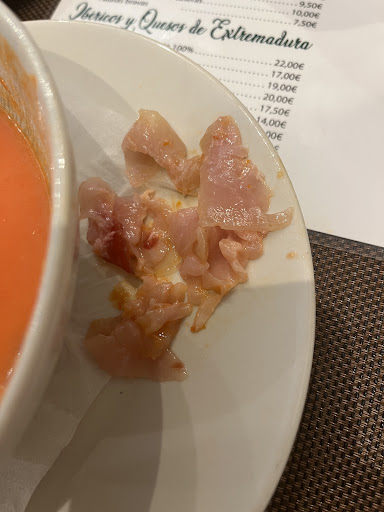 Read moreTenía entendido que Cáceres era famosa por sus tapas con la bebida, pero en este sitio fue decepcionante. Aunque sea un bar de precios económicos, hay opciones baratas y mejores que una chacina de paquete Y lo peor de todo que nos cobraron a 2,70 y 2,50 las bebidas (adjunto foto) Luego me pedí un gazpacho con jamón, en el cual me encontré más del 50% de tocino súper grueso (adjunto foto). Entiendo que haya que gastar todo el jamón, pero existe el término medio. Le doy un 2 y no un 1 porque las migas de mi pareja estaban aceptables.