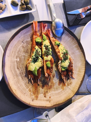 En nuestro caso, comenzamos con unos gambones sopleteados en salsa chili crab, acompañados de huevas de trucha, emulsión de hierbas y nata infusionada con azafrán... Maravillosos. Con un magnífico punto de cocción.