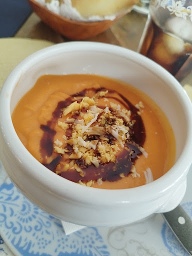 Lo otro fue un salmorejo con huevo duro. El sabor era suave, es decir, pudimos seguir hablándonos porque el ajo estaba presente pero no atroz. Tenía un sabor algo dulce que nos descolocó al principio, pero terminamos apreciando. Emulsionado muy bien.