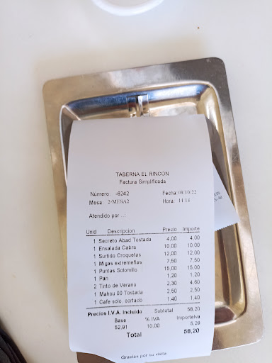 Read moreLas consumiciones son caras con respecto a los bares de alrededor y no ponen ni unas tristes aceitunas de aperitivo. Amplio reseña. Me gusta valorar el aperitivo o pincho que se pone en bares. Fui el 24/07 al Rincón porque unos amigos estaban cenando y me dijeron que ponía buen pincho. Me senté con ellos y pedí jarra de cerveza y verdejo. Mi sorpresa cuando no puso pincho. El precio fue 5,50 €. Me fui a El Monumental que está enfrente sabiendo que no ponen pincho y pedí lo mismo y me cobraron 3,50 €. Decidí volver al Rincón el 16/08 a medio día buscando el aperitivo que me habían comentado pero esta vez tampoco lo pusieron. Ya se que es una cortesía pero debe de tener un perfil de cliente para ser cortes en el que yo no encajo. Si busco pincho prefiero ir a la Minerva, otro bar de la misma plaza con precios similares, que se toman el poner pincho más como una regla que como...