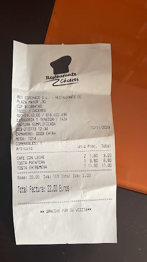 Read more¡No vengan! por favor. Entramos a comer sin leer ninguna crítica. ¡Gran error!. De entrada pedimos cerveza 00 rubia. Aparece el camarero con dos vasos de cerveza y le preguntamos porqué no la trae con el vidrio y nos la abre a nuestra vista. Dice que es que son de barril. La pruebo y me sabe a alcohol ( hace 7 años que no tomamos nada de alcohol). Entró a ver los caños y resulta que es "Sin", por lo tanto 0,9% de alcohol. Mi pareja pide una hamburguesa sin queso. Estaba muy buena y venía sin queso. Yo pido el menú. El camarero que nos explica el menú nos dice que de entremeses hay un plato de embutidos pero que por error no están en la carta. El camarero que nos sirve no menciona los entremeses, aunque ya habíamos decidido no pedirlos. Me traen un arroz meloso con setas. Es el primer arroz en mi vida que dejó entero después de probarlo y eso que tengo comidos arroces con mariscos congelados horrorosos. Después llega la presa ibérica que aunque el menú cuesta 15,50€, me dicen que lleva un suplemento de 5€. Llega el cerdo frito reseco con unas patatas cocidas con pimentón que han conseguido hacerlas malas a rabiar. De postre sandía. Está muy rica y doy gracias al agricultor, de que La Taperia Cáceres no pudiera hacer otra cosa más que cortarla. El dueño un poco sobrado con el tema de la cerveza y los camareros muy justos en su papel. Si vienen a Cáceres, pasen de largo de esta Taperia en esta maravillosa plaza y miren las críticas que suelen estar...