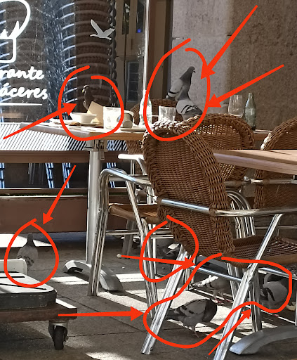 Read moreLo que se presentaba como una terraza confortable y soleada, con menú apetitoso (15€), en la Plaza Mayor de Cáceres, se ha acabado convirtiendo en una comida de lo más desagradable a causa de la auténtica invasión de palomas. A cada cliente que se iba, por lo menos 20 palomas asaltaban su mesa. Mesas que quedaban largos ratos por recoger, y curioso que las camareras no aprovechen sus viajes de regreso para recoger platos sucios que las atraen!! Se iban con las manos vacías y mientras tanto, las palomas haciéndose dueñas de las mesas. En una de estas, varias palomas han emprendido el vuelto de golpe y todo el polvo que han levantado, ha caído en mi plato. Con bichos incluidos. Evidentemente he dejado mi plato por terminar. Le pido a la camarera llamada Sonia que si podría llevarse los restos de postre de la mesa contigua para que se vayan las palomas, y atención a su brillante respuesta: "Ojalá pudiera llevármelo...., pero es que estoy muy ocupada..!" O sea, Sonia, me estás diciendo que en tu camino de vuelta, no podías haberte llevado esos platos sucios??? Qué vacilada es esta?? Se me ocurren un sinfín de calificativos para ti, Sonia. La otra camarera, pobre, hacía lo que podía, mucho más empática... De la comida, ni me acuerdo. Ah sí! Pan duro, como una roca.