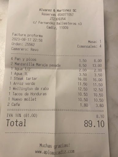 Lo segundo, si lees bien en ningún momento me quejo de los precios de la comida ni el agua, solo de la manzanilla (y para eso está el ticket subido, que hay que explicarlo todo). Y tampoco me quejo del precio del pan, pero no digas que me levanté a pedirlo por favor… un poco de honestidad.
