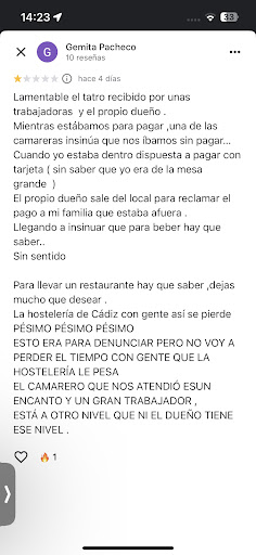 Read moreMe parece de vergüenza que te pongan de que te vayas sin pagar por parte del dueño que no tenía ni idea que ya estaba pagado y de borracho por parte de una trabajadora cuando solo te has tomado un café , fíjate que íbamos con una discapacitada en silla y niños pequeños como para irte sin pagar , pero no te preocupes que el Karma existe y ya me encargaré de que te hagan una visita y espero que a los trabajadores los tenga bien y todo en regla . Ha se me olvidaba y bastante caro , que te vaya bien ………..Enseña el vídeo se va a ver que estaban pagando y salió solo una persona para pedir dos euros que faltaba que ya aún lo pago otra persona que estaba dentro y no se disteis cuenta que venían con nosotros , pero claro era mejor insultar y decir que se iban sin pagar y que si no sabían beber que no bebiera ni que la camarera supiera lo que se bebió cada uno y a la hostelería lo que menos le hace falta personas como ustedes que insultan a la gente diciéndole borracha por toda la cara y ante eso evidentemente no nos vamos a callar faltaría más señor dueño y qué casualidad que ya no se puede escribir más reseñas a que tienes miedo y somos personas trabajadoras de la hostelería por si te interesa , en la grabación estaría bien que te fijaras que íbamos con niños pequeños y con silla de ruedas y claro sin pagar 🥳🥳🥳 , vergüenza te debería dar por 52€ asquerosos , pero claro mucha gente lee esto y tienes que defender lo indefendible...