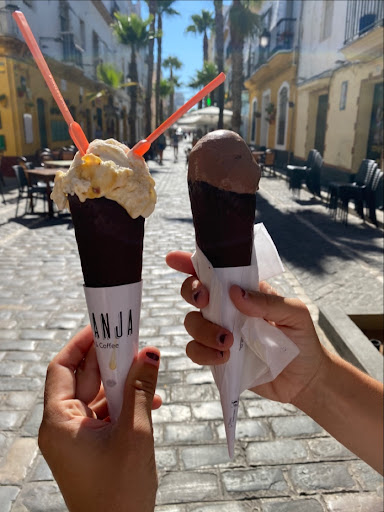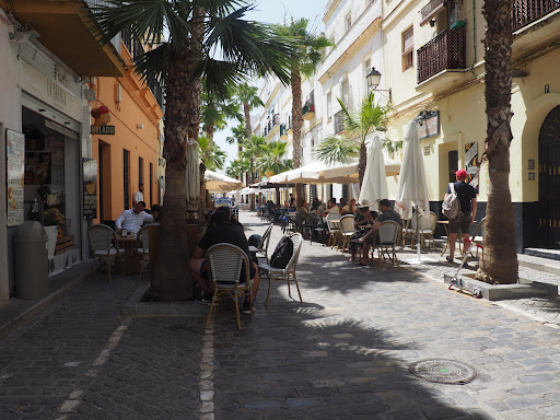 26th May 2021: We chose to give desert a miss at the restaurant we stopped at so that we could enjoy a refreshing ice-cream somewhere in Cadiz. Somehow there was no ice-cream parlour in view in any of the small streets we walked through...until we found Calle Virgen de La Palma, deliciously shaded with palms and parasols with small restaurants with terraces...AND LA GRANJA! Prices were honest and the selection was mouth-watering. The 2 ladies were very pleasant and we were able to sit inside right by the entrance, enjoying 2 waffle cones of Pedro Ximenes (flavoured with the regional Jéres wine) and Viva La Pepa, the other with strawberry sorbet and mango sorbet. There's plenty of delicious treats here for those with a sweet tooth, including coffees. A very civilised little street that deserves a...