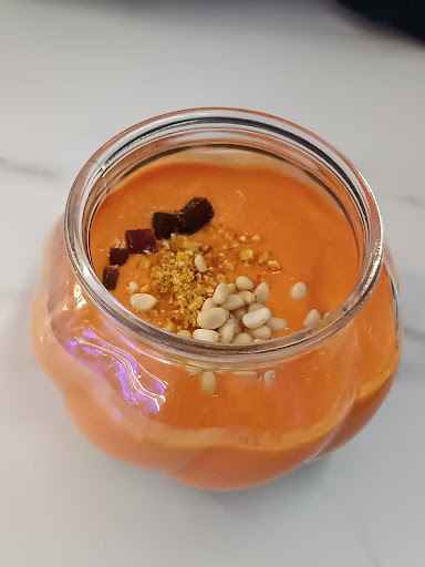 Salmorejo de manchego con piñones y virutas de mojama y polvo de kikos: Lo probé en el antiguo local de la avenida hace unos años, ese sí estaba muy bueno. Ahora, sabiendo el precio de los piñones, buena cantidad, la justa y necesaria. Entre las virutas de mojama no suman ni un cuarto de lonchita, y el queso han pintado el fondo del florero, inexistente. Y los kikos... un kiko aplastado, fin. Mucho nombre y poco fundamento. Está bueno, como cualquier otro.