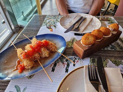 Visitado el 31/08/23. La comida estaba increible. Cada plato podría sorprender con algo. Lástima que el servicio no cumpliera con los estándares del restaurante. Llegamos tarde, a las 22:40 y queríamos sentarnos junto a la ventana, pero no nos permitieron aunque el restaurante estaba medio lleno y dejaron de recibir pedidos 15 minutos después. Nos dijeron que claro que teníamos que pedir y tener todo al mismo tiempo, pero por suerte teníamos algo de tiempo entre platos. La comida era deliciosa. rico en sabores espectaculares. Teníamos los tacos que eran un poco picantes, pero perfectos, las gambas también estaban muy frescas y crujientes, la carne de cerdo con salsa de maní se realzó con otra salsa que equilibraba la dulzura, ¡la lubina estaba deliciosa! cocinado a la perfección, con una mezcla de verduras. El camarero vino a nuestra mesa justo cuando estábamos terminando el plato principal para acelerar el pedido del desierto. Comimos un coulant de pistschio, que también estaba delicioso. Estaba muy rico y un poco dulce pero no demasiado y perfectamente equilibrado, con la bola de helado de mango y frutos secos. El escritor fue simplemente grosero y nos hizo sentir no bienvenidos y estaba claro que quería irse a casa. El personal estaba cerrando el lugar e imposibilitó disfrutar en paz la última parte de la cena, haciendo mucho ruido al cerrar el lugar. Un camarero en particular fue muy obvio poniendo la cara de aburrimiento y molestia de que todavía estábamos allí. Sabíamos a qué hora cerraba el lugar y salimos a las 12.05, por lo que no había necesidad de tales escenas. Para un lugar tan elegante, el servicio simplemente no estaba a la altura que esperábamos. En general, la comida fue definitivamente una gran experiencia, pero es una pena que no cumpliera con el estándar...