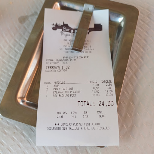 Read moreHoy hemos comido en "Miguelito" y la experiencia ha sido muy desagradable. Para empezar hay que resaltar la poca simpatía del camarero que nos ha atendido. Empezamos con los colines que nos han servido y que estaban rancios. El camarero lo reconoce y lo achaca a "la humedad". Nos dice que no nos los cambia porque todos están igual. Pedimos croquetas de jamón, salmorejo, rabo de toro y riñones al jerez. He de decir que el salmorejo, las croquetas y el flamenquín se podían comer, pero el rabo de toro insulso y los riñones al jerez incomibles. Le pedimos al camarero que nos retire el plato de riñones y con mucha antipatía nos dice que no sabemos a qué saben los riñones al jerez y que nos lo piensa cobrar. Nosotros no habíamos pedido en ningún momento que no nos lo cobraran. Molesta, hablo con el dueño y me dice que los riñones están perfectos y que lo que falla es nuestro paladar que por algún motivo, hoy "no nos funcionaba". Esa respuesta es inadmisible. Finalmente, el dueño le pide al camarero que no nos cobre los riñones, cosa que no consiento, ya que el problema no era pagarlos o no. El problema es que me he sentido insultada. Es un lugar que vivirá de turistas incautos que no repetirán. En conclusión si no queréis comer muy mal y tirad vuestro...