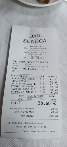 Read moreQué nadie se lleve a engaños. El Séneca es un bar de barrio de los de toda la vida. Y así lleva 50 años. Barra con parroquianos y sus tertulias, el dueño Eloy vociferando como ya lo hacían su padre, su tío y su abuelo, tv con el fútbol que toque,...vamos un bar del Campo de la Verdad con denominación de origen. En cuanto a la cocina, sus bravas siguen siendo únicas en su elaboración, textura, sabor y presentación desde hace décadas. Las mollejas fantásticas. La oreja como si estuvieras en las mejores tabernas madrileñas. Para acompañar con una cerveza muy bien tirada, las gambas cocidas siempre en su punto, igual que el salpicón y los boquerones en vinagre. Por último resaltar la guarnición de col al ajillo que suele acompañar las raciones y que muchos intentan imitar y pocos igualar. En resumen, que nadie espere estrella Michelín, pero Eloy y su familia seguirán teniendo siempre un hueco en la constelación de la hostelería popular cordobesa. Y por...