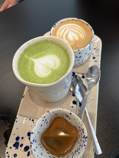 Pedimos un espresso macchiato con café de Etiopía y un Ice Matcha Latte con leche de almendra para llevar (take away). Aunque también teníamos muchas ganas de quedarnos sentados en ese sitio tan bonito, disfrutando de un café con un croissant y bebiendo de una de sus tazas muy interesantes que tenían en la barra, pero por las prisas tuvimos que continuar.
