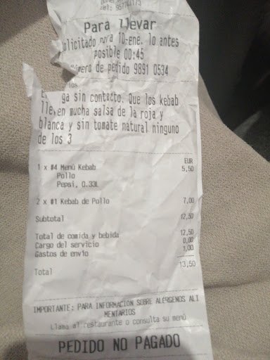 Read moreNo recomendado por su falta de profesionalidad, hicimos el pedido a las 21:15 mediante Uber, ponía entrega de 21:50 a 22:10, viendo que no llegaba el pedido llame y me decían que quedaba 15 minutos, volví a llamar después de pasada media hora, y así todo el rato dándome largas de que si el repartidor iba de camino, llame por 5 veces.... Al final la comida vino a las 23:30 justo cuando ya estaba intentando cancelar el pedido... Al teléfono se ponía una chica que se llevaba todas las quejas porque el encargado al cual ella preguntaba no daba la cara, solo le decía a ella que tenía que decir, lo único bueno que puedo decir es que estaban buenos y vino correcto el pedido, pero no voy a volver a pedir...