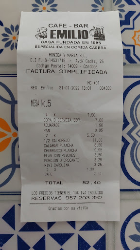 Read moreOJO!!! Está claro que este establecimiento, que estoy segura, en su día fue un referente del buen hacer de la comida cordobesa, HA CAMBIADO DE MANOS!!! El Bar Emilio, establecimiento abierto desde 1985, desde luego, ahora, no está regentado por Emilio. No es mi intención hacer una mala reseña, si no advertir al resto de usuarios, que como yo, nos guiamos en ocasiones por las reseñas de Google, o como en mi caso, buscando locales un poco más auténticos, de barrio, fuera de las zonas y locales meramente para turistas, y nos encontramos con este tipo de sorpresas. Les deseo lo mejor a quienes ahora lo trabajan, pero lo siento, no es el Bar Emilio que yo me esperaba encontrar. Parece que ha mantenido los platos de la antigua carta, pero nada que ver en su ejecución ni presentación, para muestra la foto que adjunto del "antes" y el "ahora". Gracias de todas maneras, fueron muy amables en la atención.