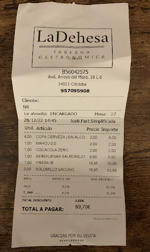 Read moreUn solo empleado para barra y terraza en épocas navideñas, con la consiguiente merma en el servicio, que fue muy lento (una hora de reloj para comer). En primer lugar destacar que nos sentamos en una de las pocas mesas recogidas que había, pero sucia ante la falta de limpieza con una balleta. Ante esto, se le comunicó al empleado que si podría hacer el favor de limpiarla un poco. Tras quince minutos y referirlo por segunda vez, el empleado la limpió con una balleta con mal olor. Respecto a la carta, aparenta variedad, pero para conocimiento de los que leen las reseñas solo tienen presa ibérica de bellota y solomillo de vacuno, o en otras palabras, ¡¡sólo dos, de los siete platos que aparecen en la parte de la carta de “Carnes de la Dehesa”!! De los platos de “Sugerencias” no tenían ninguna, el camarero manifiesta literalmente “No tío, eso es en eventos especiales tú sabes, tío”. Reseñar en esta sintonía las formas vulgares del empleado al referirse, no solo con nosotros, sino con la clientela en general; con formulaciones tales como a la mesa de al lado, un matrimonio de edad avanzada: “Claro tío, ahora voy que tú sabes, que tengo dos manos” ante la solicitud de éstos últimos de unas aceitunas. Dicha actitud denota un malestar manifiesto por parte del trabajador por encontrarse, como digo, solo en barra y terraza en horario de comidas. Respecto a la comida, una hora después, cabe destacar favorablemente la calidad de la carne y de los productos. A modo de resumen, bastante caro para el...