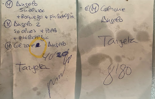 Ahí está el papel del pedido y aparece tachado el 2, lo habéis tachado vosotros porque cuando llegó el repartidor la 1 vez y faltaba la calzone se lo enseñe.