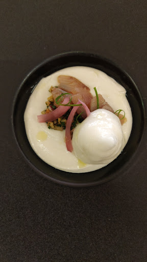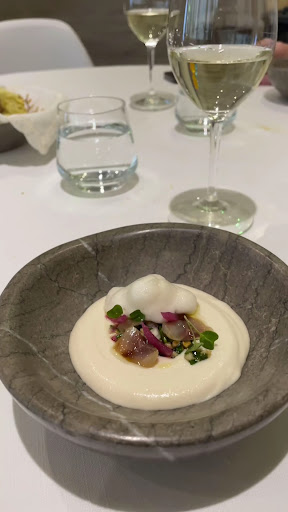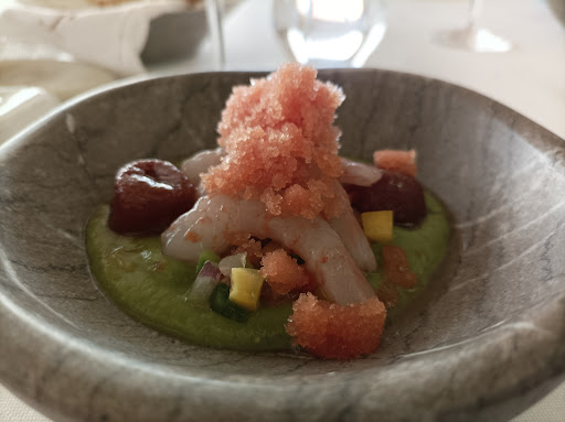 En los siguientes platos tuvimos una experiencia agridulce. Sí, todo estaba muy bueno, pero no especialmente bueno, eran productos de calidad pero no por la elaboración, sino por el producto en si. Resumiendo platos, un puré de hiervas, gambas y granizado de cebiche, muy bueno, un tartar de presa ibérica, muy bueno pero nada especial, gran producto pero solo eso, molleja con setas que lo mismo, buen producto pero ya, lubina en salsa de adobo, pues eso, una lubina frita como en cualquier sitio con una salsa que tenía semejanzas con el adobo con toques de pimentón, ajo y cítrico, que incluso este no le gusto nada a mi acompañante, cordero con berenjena y hummus, y por desgracia he de decir que el cordero estaba más seco de lo que esperaba, aún así rico en conjunto, una tabla de quesos muy buenos, 4 cortes, y por último, y sinceramente, espectacular, gachas con crema de pestiños y helado de menta creo (porque no nos explicaron mucho mas), un gusto de los dioses del Olimpo de verdad. Todos estos platos, fueron presentados como os lo digo, sin detalle, sin chispa, sin ganas y sin crear ese ambiente de ansías, ganas y tentación que en otros lugares donde he ido han conseguido haciendo de esas una experiencia inolvidable tanto por el plato como por los entre platos. Los vinos no nos los presentaron, solo nos servían y con suerte nos decían que eran un Rivera, o incluso ni eso. La falta de interés, desgana y poca gracia que había entre los platos hicieron que fuese una experiencia insulsa en el que, incluso, en algún momento nos sentimos hasta incómodos.